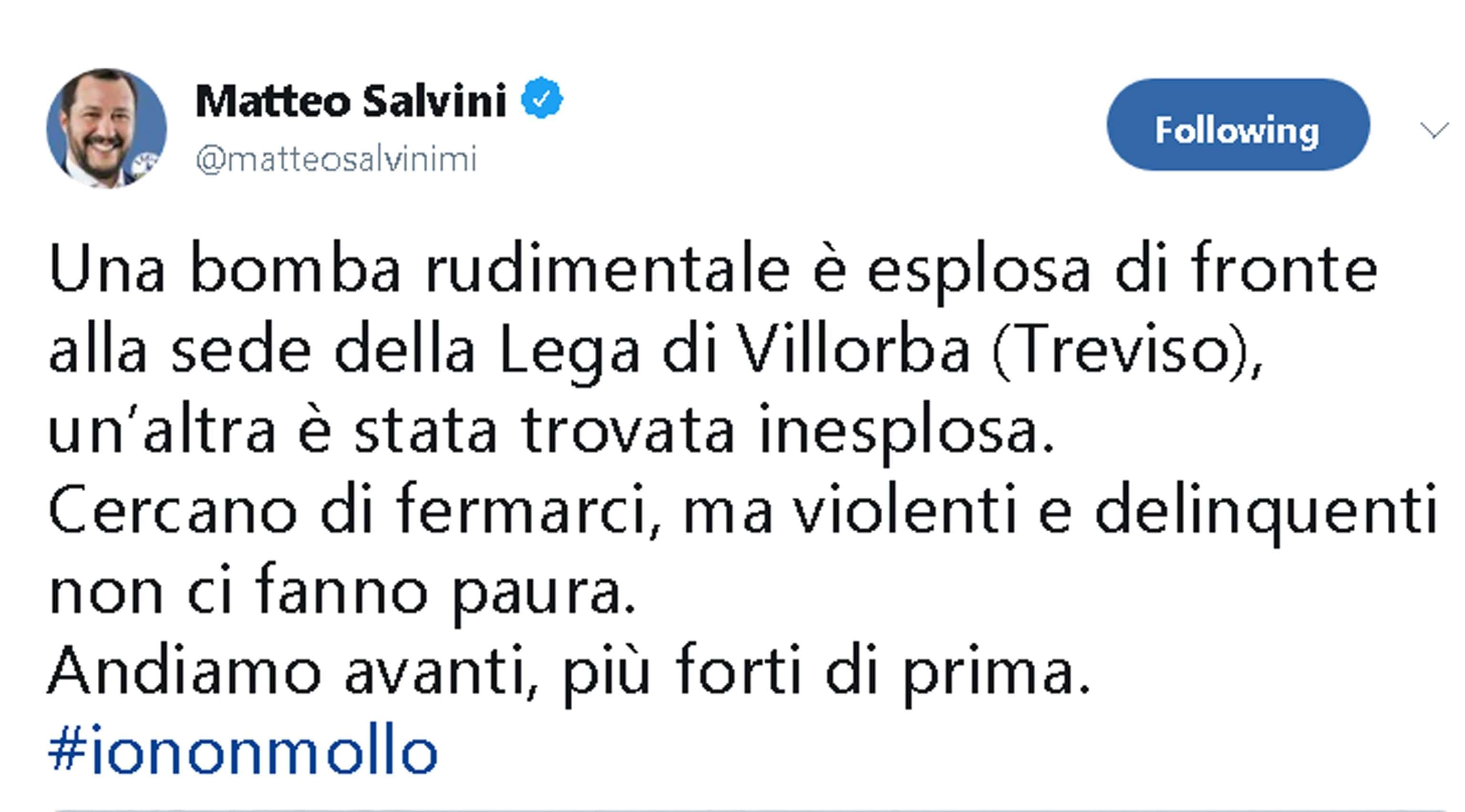 Sulla vicenda è intervenuto anche il governatore del Veneto, Luca Zaia: “Si sia trattato di un atto dimostrativo o della volontà di far del male, di ordigni ad alto potenziale oppure no, poco importa: si tratta comunque di un atto gravissimo, esecrabile, speriamo non il primo di una possibile inquietante spirale – ha affermato – un bruttissimo segnale contro quella che non è soltanto la sede storica di un movimento e di un partito, ma anche un luogo dove i cittadini e i militanti si ritrovano per un confronto che deve sempre essere aperto, franco e democratico. Da noi è così, se qualcuno altro vuol far prevalere altri linguaggi, sappia che troverà sempre una ferma e condivisa opposizione democratica”.