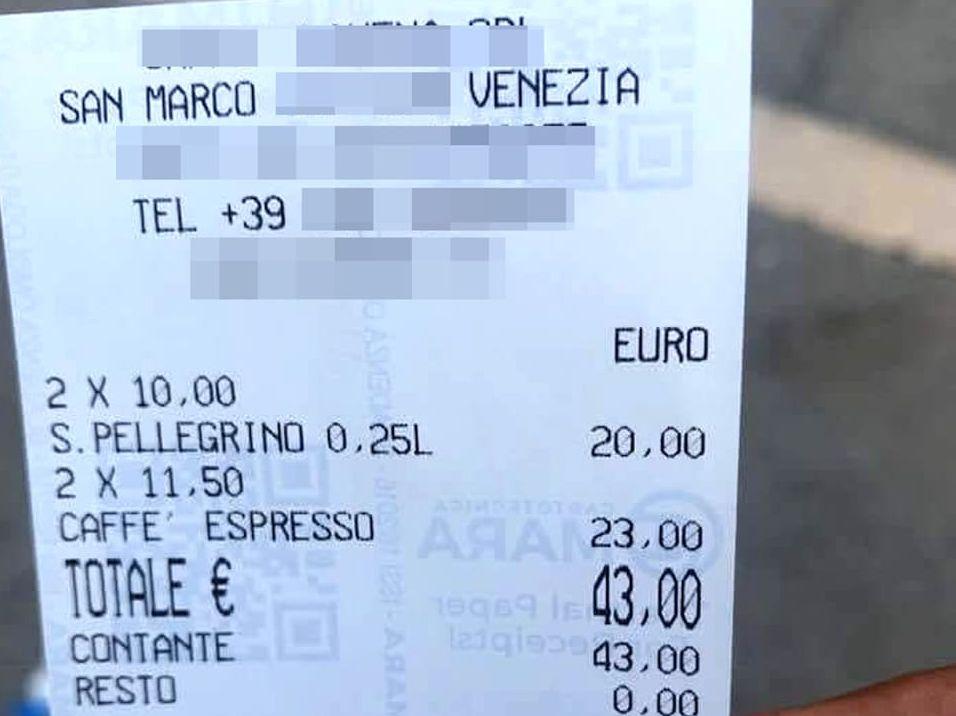 Venezia, l'ennesimo scontrino pazzo: due acque e due caffè, 43 euro