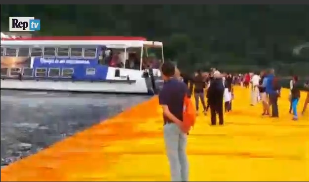 “Tante le persone che in quel momento stavano attraversando il cammino sull’acqua di Christo, come sempre. E il telo arancione già richiede alcuni interventi di manutenzione, più che previsti. Ogni due-tre giorni alcuni tratti di copertura verranno sostituita. Si comincia con il tratto sulla terraferma tra Peschiera e Sensola, che costringe però a limitare l’accesso alle passerelle. Lo stop durerà dalle 21 alle ore 7. Negli orari di chiusura, l’altro pontile potrà accogliere non più di mille persone”.
