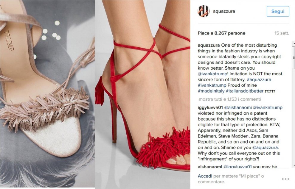 NEW YORK – “Ivanka Trump ci copia le scarpe“. Questa l’accusa che l’azienda italiana Aquazzura ha mosso alla figlia di Donald Trump, candidato repubblicano alla Casa Bianca nel 2016. L’azienda calzaturiera fiorentina ha fatto causo a Ivanka Trump per plagio e ha scelto Instagram per denunciare la sospetta somiglianza tra le scarpe da loro prodotte in Italia e quelle prodotte dall’impresa della donna.