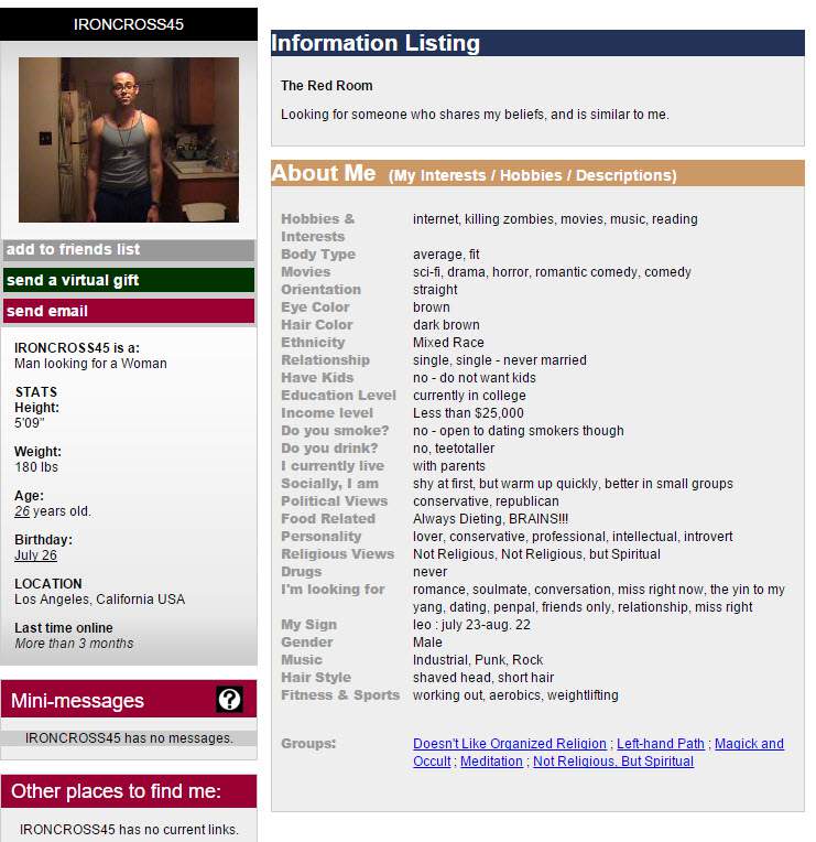 “non religioso ma spirituale. Un amante, conservatore, professionale, intellettuale e introverso di razza mista, che non beve ed è conservatore e repubblicano. I miei interessi sono internet, uccidere zombie, film, musica e leggere”.