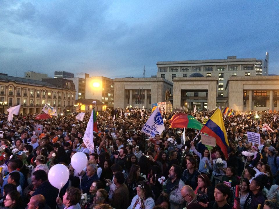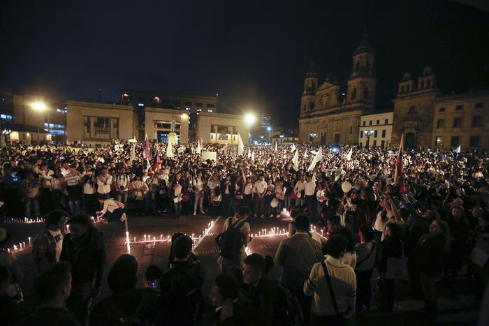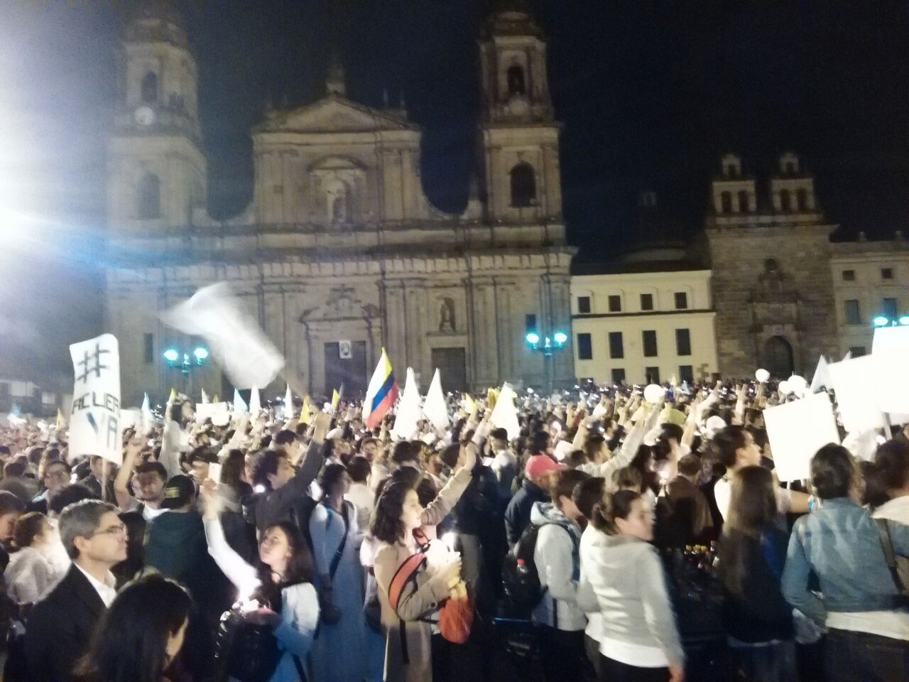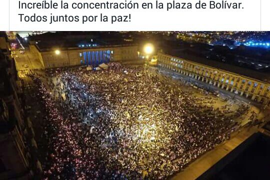 L’iniziativa segue quelle dei giorni scorsi che si sono tenute a Bogotà, in altre città della Colombia (le foto in fondo all’articolo) e in diverse località del mondo (Barcellona, Germania, Australia, Dubai, Ottawa e Parigi). Le manifestazioni, convocate da gruppi studenteschi e movimenti sociali sui social network, con l’hashtag #EnSilencioPorLaPaz (In silenzio per la pace) hanno riunito oltre 30 mila persone solo a Bogotà, che sono sfilate senza lanciare nessuno slogan e portando candele e bandiere colombiane fino a sfociare in Piazza Bolivar, nel centro della città.