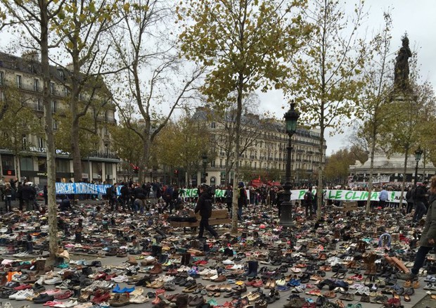 A niente è valsa per compensare l’annullata manifestazione a favore del clima la distesa simbolica di scarpe, tra cui quelle di Papa Francesco a République a Nation. Non potendo effettivamente marciare gli ambientalisti francesi avevano comunque messo in scena una marcia simbolica per chiedere ai leader mondiali un cambiamento sul fronte delle politiche climatiche. Centinaia di scarpe sono state raccolte dall’associazione Avaaz e allineate su Place de la Republique: mocassini, stivaletti, infradito, sandali che simboleggiano una marcia silenziosa e pacifica. I manifestanti pacifici si sono anche stretti le mani e dato vita a una catena umana che corre lungo Boulevard Voltaire e si interrompe dinanzi al Bataclan, in segno di rispetto per le 90 persone rimaste uccise nel massacro alla sala concerti.
