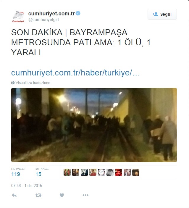 In una Istanbul sempre all’erta tra possibili minacce dell’Isis, il conflitto aperto con il Pkk curdo e le azioni isolate di gruppi estrema sinistra si teme subito un attentato. A esplodere è stato un ordigno artigianale lasciato lungo la strada. Secondo i primi rilievi degli investigatori un tubo bomba, riempito di materiale esplosivo per provocare una deflagrazione in grado di uccidere. Le schegge hanno distrutto i vetri di un treno di passaggio, costringendo all’evacuazione dei passeggeri e scatenando il panico nella zona, dove sono accorsi diversi mezzi delle ambulanze e dei vigili del fuoco. La metropolitana è stata chiusa per permettere i soccorsi e mettere in sicurezza la zona, mandando nel caos il traffico già intenso della metropoli sul Bosforo.