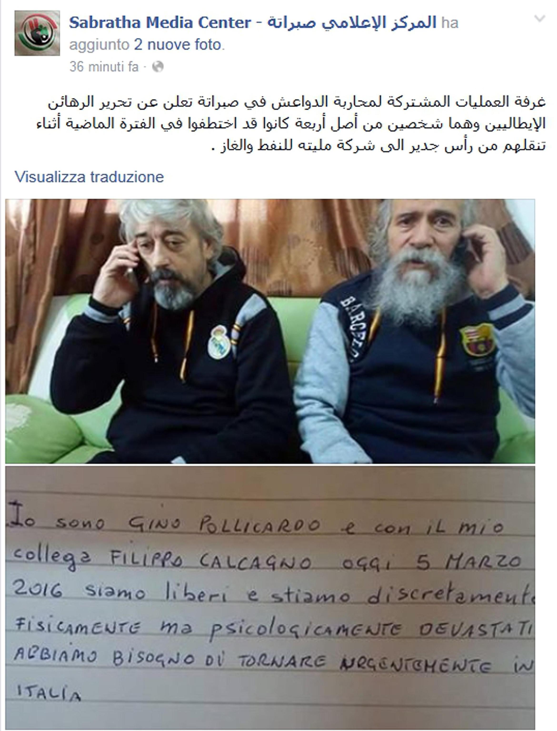 ROMA – Gino Pollicardo e Filippo Calcagno sono stati liberati in Libia e stanno tornando in Italia. Ma come è avvenuta la liberazione? Da soli, dopo un conflitto a fuoco con dei miliziani, oppure dopo un blitz? Le barbe lunghe, i volti segnati e lo sguardo ancora un po’ spaurito e smarrito. E diciotto secondi di video solo per dire: “Stiamo bene, siamo in un posto sicuro, vogliamo tornare subito in Italia perché abbiamo bisogno di abbracciare i nostri familiari”. La grande paura per Gino Pollicardo e Filippo Calcagno è passata. I due italiani rapiti in Libia sono liberi dalla mattinata di oggi quattro marzo, sono stati portati in un posto di polizia e, giustamente, non vedono l’ora di tornarsene in patria.