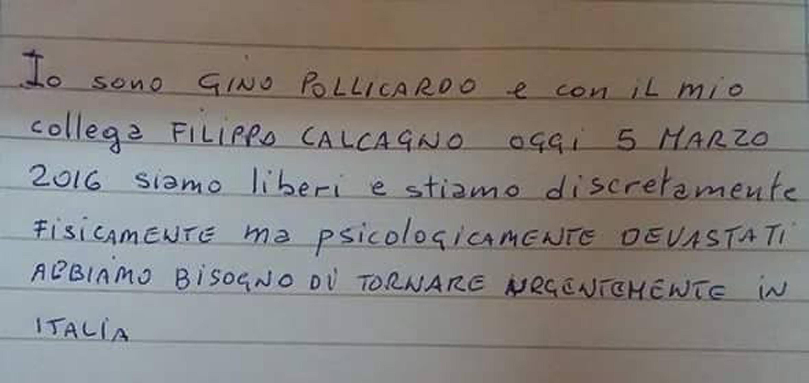 “Sono Gino Pollicardo e con il mio collega Filippo Calcagno oggi 5 marzo 2016 siamo liberi e stiamo discretamente fisicamente, ma psicologicamente devastati. Abbiamo bisogno di tornare urgentemente in Italia”