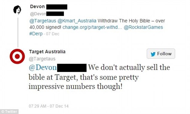“Attualmente non vendiamo la Bibbia a Target, ma il vostro numero di firme è impressionante!”.