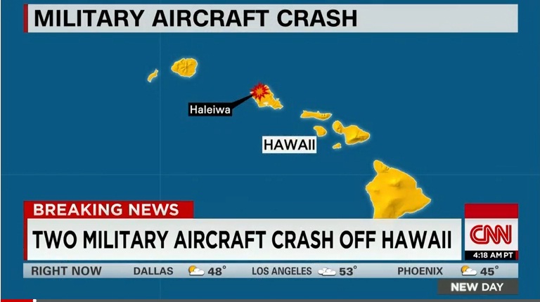 L’impatto è avvenuto tra due grossi CH-53s, velivoli da trasporto dei marines con 6 persone a bordo ciascuno, davanti all’isola di Oahu, non lontano da Haleiva. Non sono ancora chiare al momento le cause e la dinamica dell’impatto, ma non si fermano le ricerche. Secondo un bollettino del servizio meteo americano Weather Channel al momento della collisione c’erano venti deboli e una leggera pioggia, che non spiegherebbe difficoltà di manovra nei mezzi.