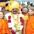 Il ‘sadhu’, battezzato dalla stampa ‘Golden Baba’, si è presentato al bagno rituale nel fiume insieme ai suoi discepoli con lunghe collane, bracciali che ricoprivano l’intero avambraccio e massicci anelli su tutte le dita.