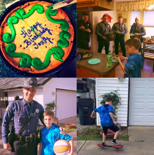 Insieme ad alcuni suoi colleghi, il poliziotto ha dunque deciso di fare una sorpresa a Toxey, senza avvertire i suoi genitori: si sono infatti presentati con una torta, hanno giocato con lui ad accendere la sirena e il lampeggiante, si sono concessi una partita a basket facendo felice il bambino.
