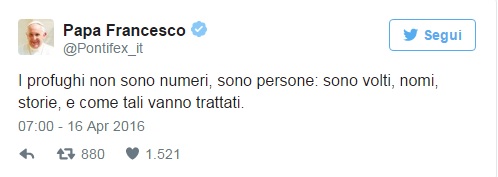 LESBO (GRECIA) – “I profughi non sono numeri, sono persone: sono volti, nomi, storie, e come tali vanno trattati”. Lo ha scritto Papa Francesco in un tweet inviato dall’aereo che lo ha portato a Lesbo. Lo scopo principale del viaggio è quello di “portare conforto a tanti profughi”. Lo afferma lo stesso Pontefice nel messaggio a Sergio Mattarella inviato “nel lasciare il suolo italiano per recarmi in Grecia”.