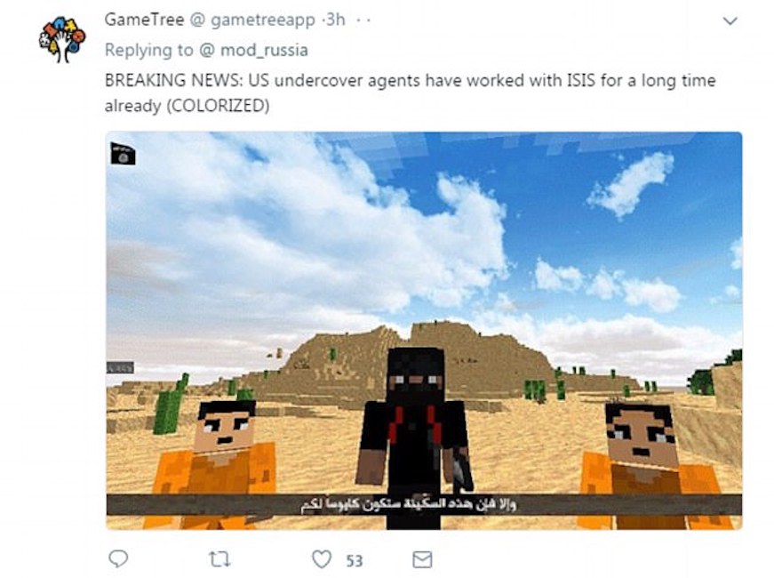 Una ricerca inversa dell’immagine, mostra che è stata caricata la prima volta come parte di un videogame promozionale per pc, che si svolge durante la guerra in VietNam. “Il ministero della Difesa russo utilizza immagini di videogioco come prova che gli USA stanno collaborando con l’Isis”, ha scritto Eliot Higgins, un ricercatore associato in visita al King’s College London e esperto di indagini online per il sito Bellingcat.