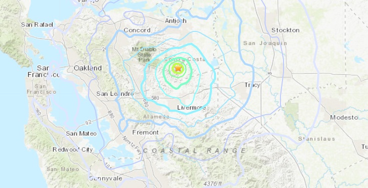 Il sistema di monitoraggio sismico statunitense USGS ha registrato due terremoti il 16 luglio. Il primo alle 20,11 ora locale, le 3,11 in Italia, con magnitudo del 4,3, ipocentro a 12,4 chilometri di profondità ed epicentro tra Byron, Brentwood, Blackhawk, Concord e Hayward, ma è stato avvertito distintamente anche a San Francisco.