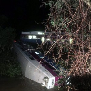 La causa del deragliamento non è chiara. I funzionari hanno detto pioveva forte nella zona in quel momento. Le immagini pubblicate su Twitter ha mostrato una delle vetture parzialmente sommerso in acqua.