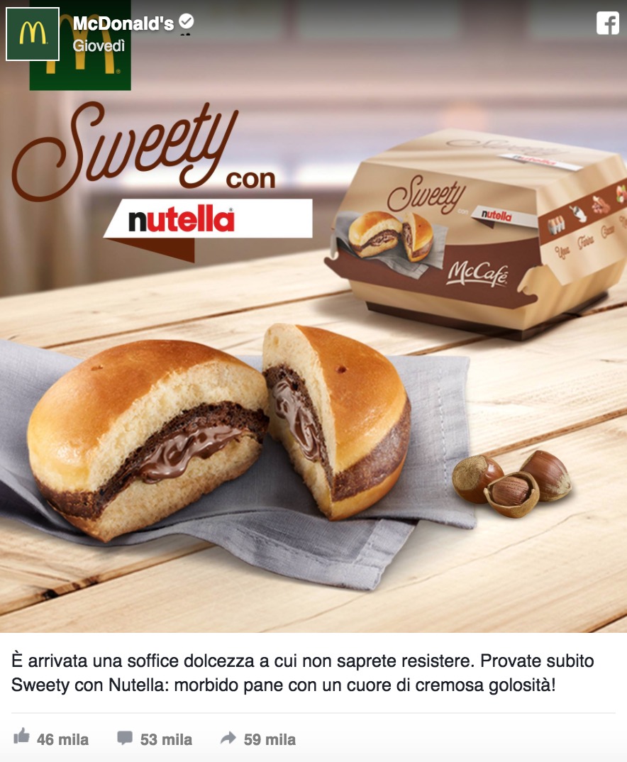 ROMA – Pane e Nutella in versione McDonald’s. L’annuncio è stato pubblicato su Facebook dalla catena di fast food. “È arrivata una soffice dolcezza a cui non saprete resistere. Provate subito “Sweety con Nutella”: morbido pane con un cuore di cremosa golosità”, è il post, accompagnato da un’immagine del panino dolce.