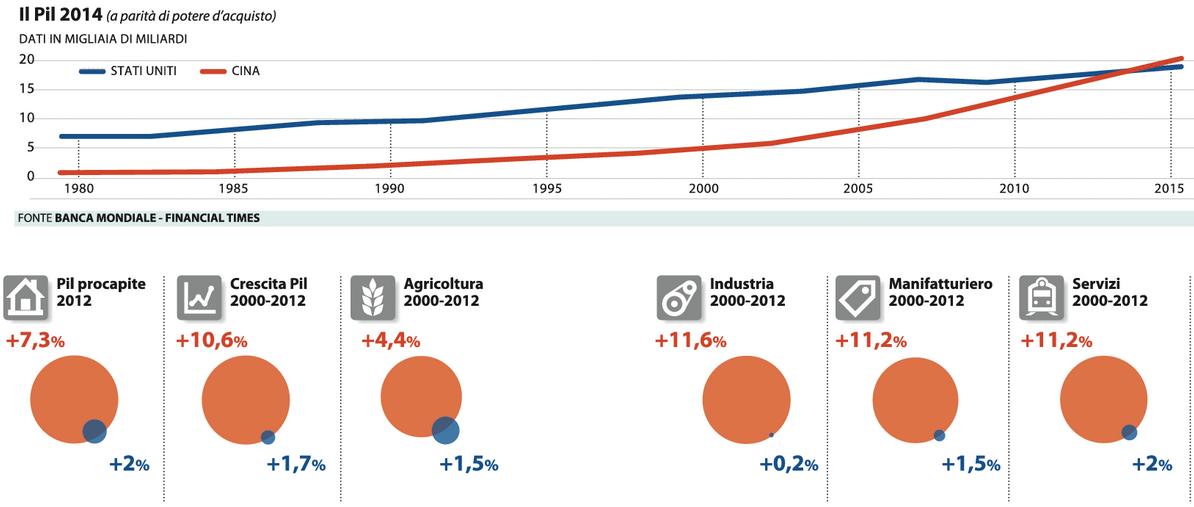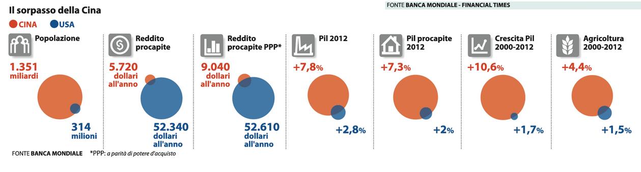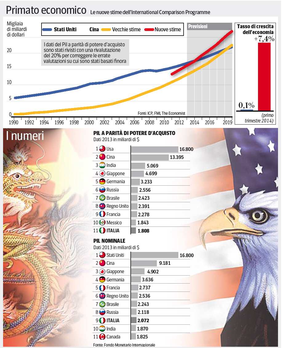 Il vero primato resta Usa. Resta poi il fatto che la cifra del Pil non consacra un vero primato perché non tiene conto della ricchezza “pro-capite”, delle condizioni di lavoro, di benessere e del rispetto dell’ambiente. Quindi una Cina con 1,351 miliardi di abitanti avrà anche un Prodotto interno lordo di poco superiore a quello di un’America con 314 milioni di abitanti, ma con i suoi 9.040 dollari pro-capite è ancora lontana anni luce dai 52.610 dollari di Pil pro-capite degli Usa (dati PPP, a parità di potere d’acquisto).