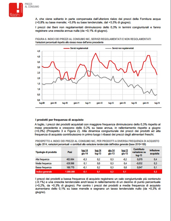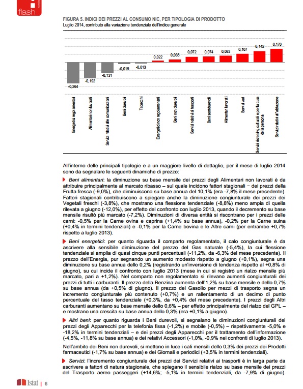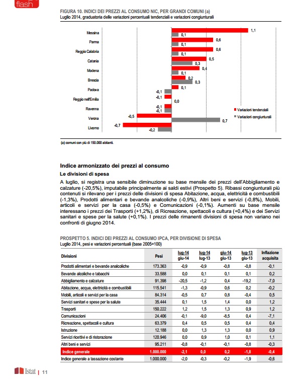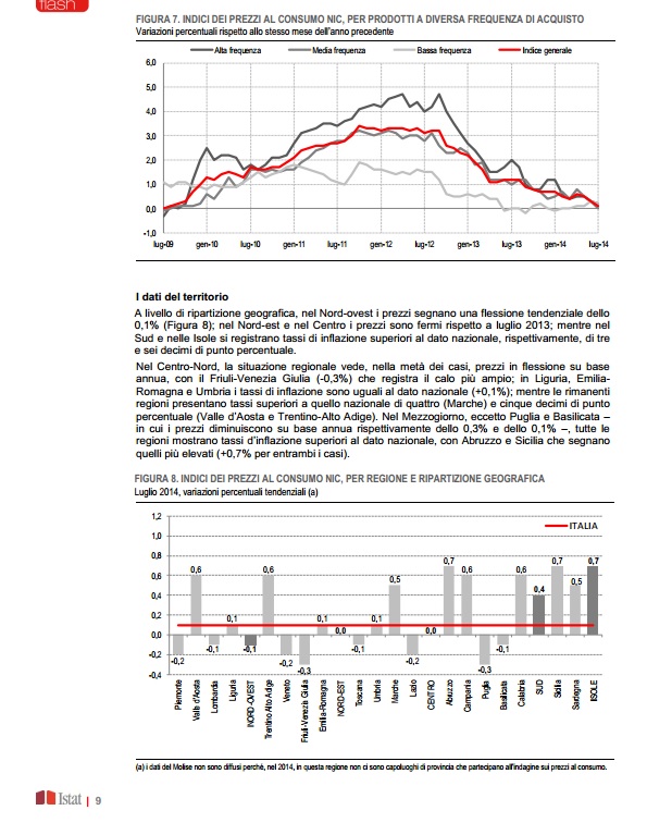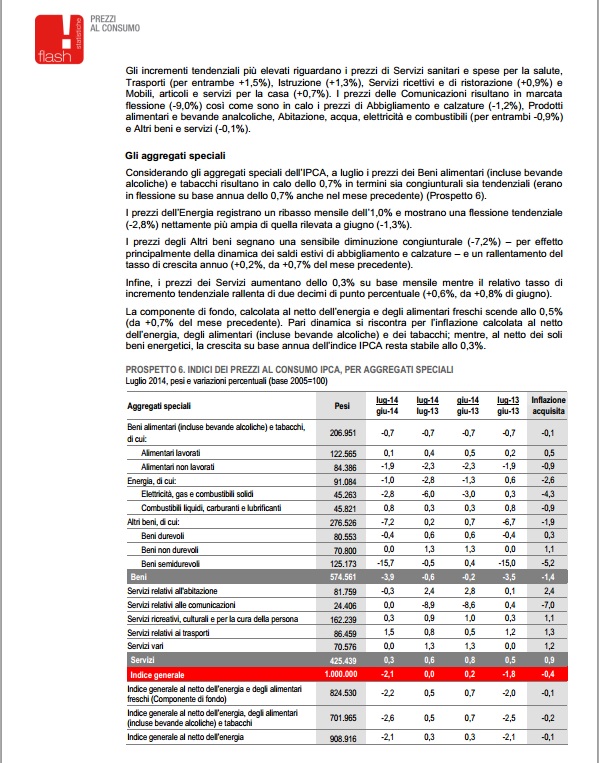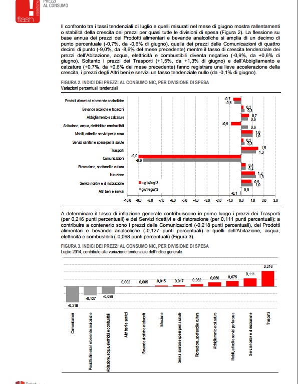 “Nel mese di luglio 2014, l’indice nazionale dei prezzi al consumo per l’intera collettività (NIC), al lordo dei tabacchi, diminuisce dello 0,1% rispetto al mese precedente e aumenta dello 0,1% nei confronti di luglio 2013 (era +0,3% a giugno), confermando la stima preliminare.