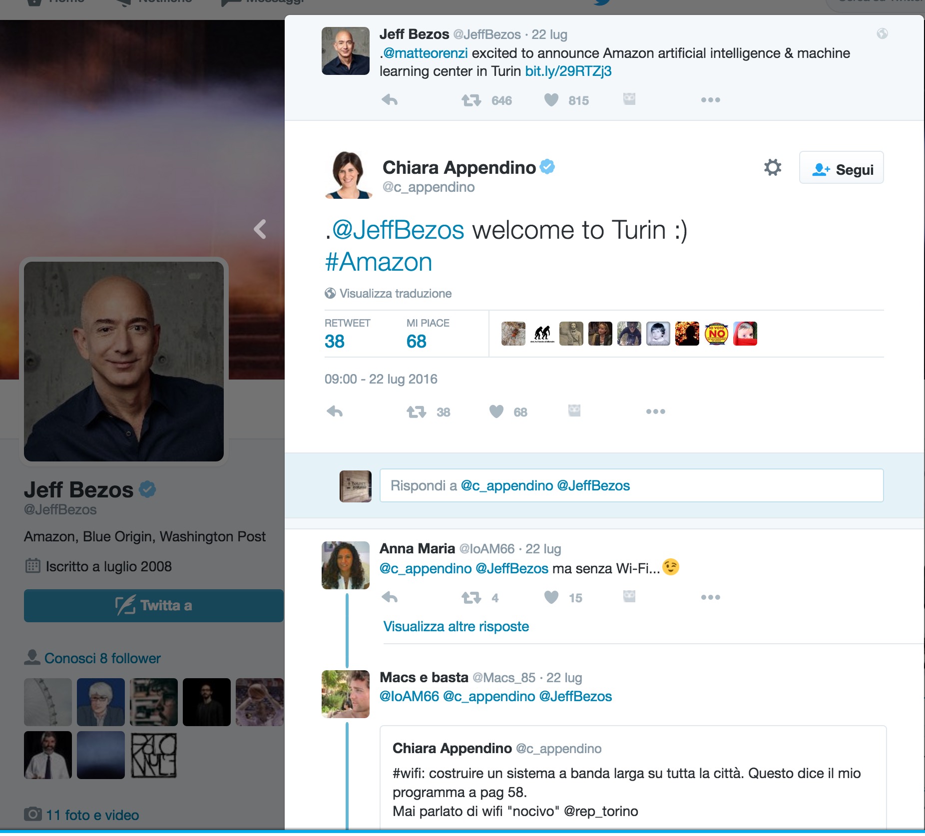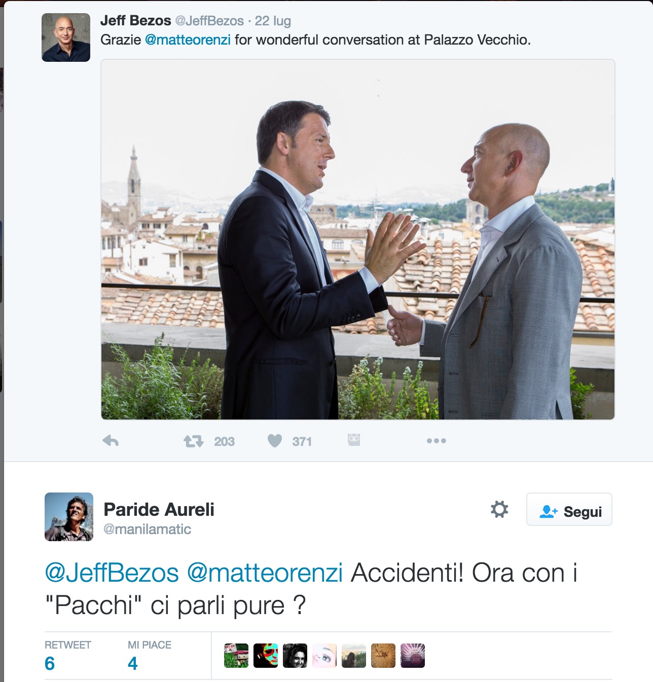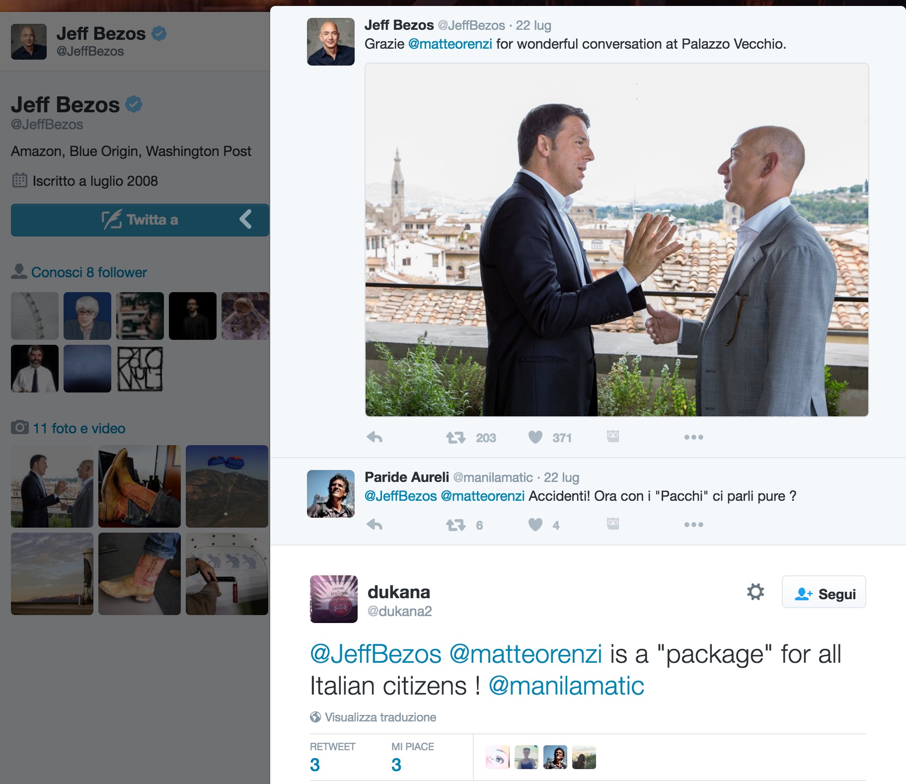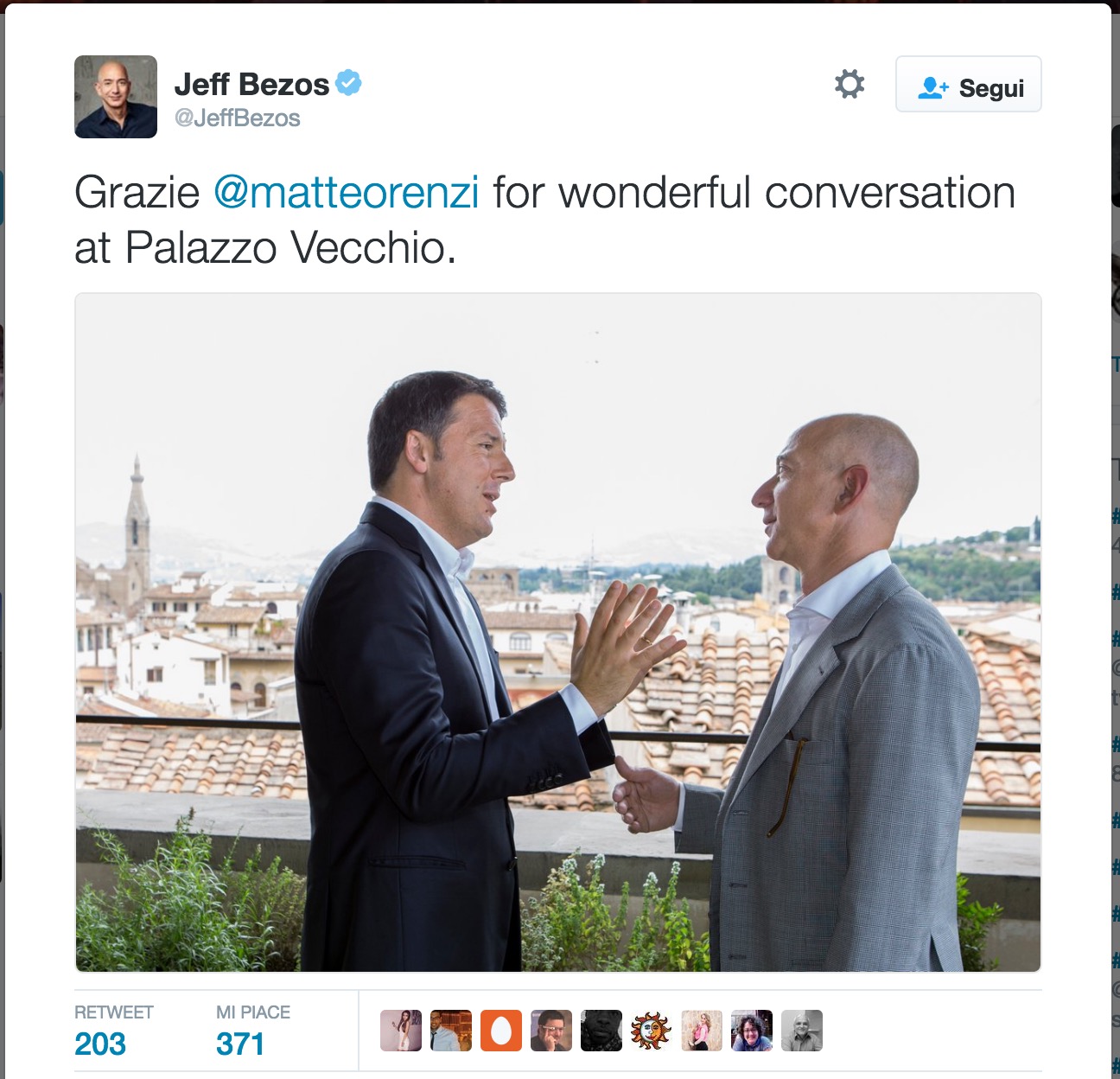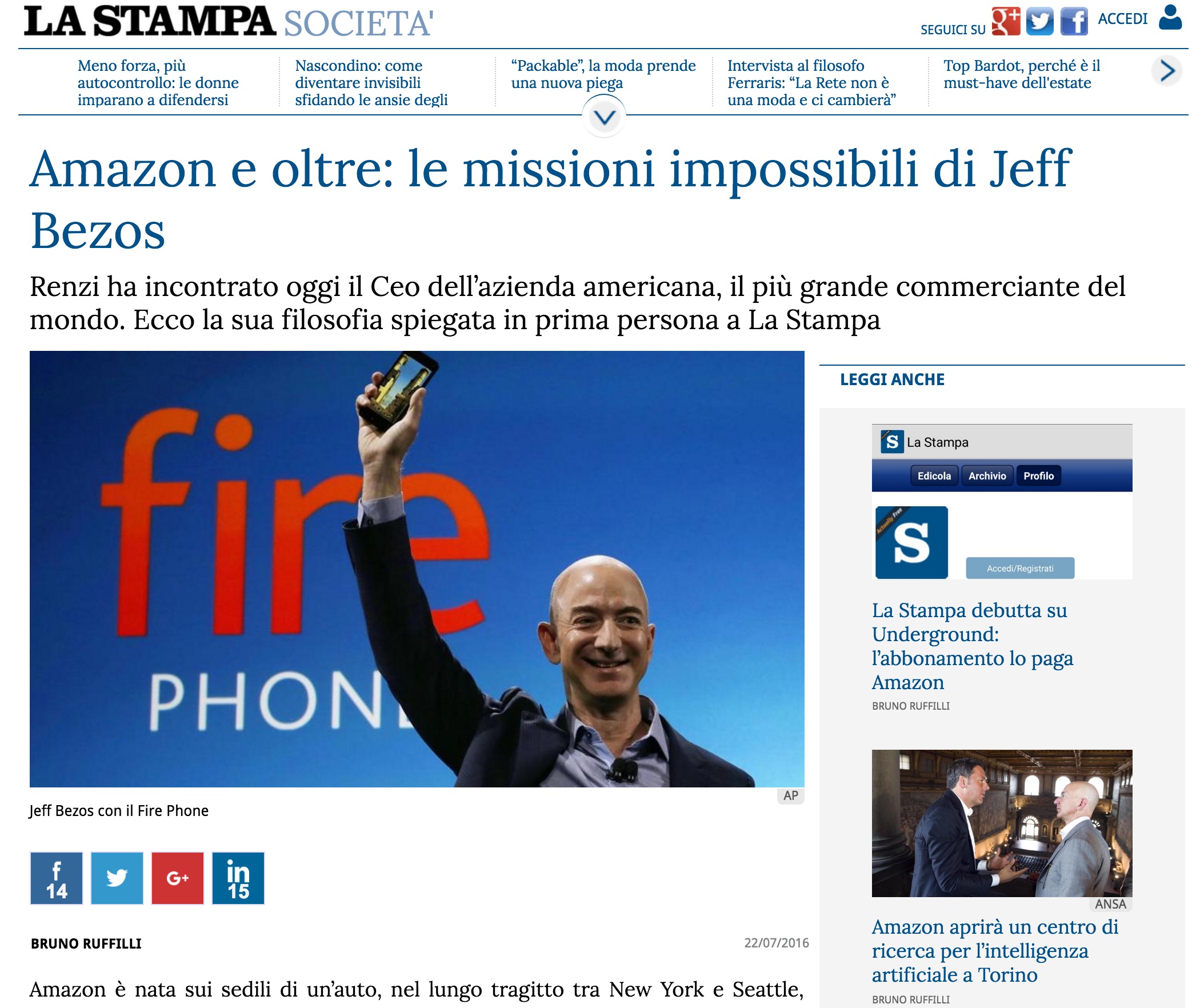 Bezos ha incontrato Matteo Renzi, che lo ha accorto a braccia aperte così come il presidente del Consiglio usa fare con i grandi manager, ed è stato intervistato – come una popstar, un guru della stessa religione di Steve Jobs – da La Stampa e da Repubblica. Il 5 luglio scorso il direttore della Stampa Maurizio Molinari aveva annunciato: “La Stampa è il primo quotidiano gratis su Amazon Underground, la piattaforma che offre migliaia di applicazioni, giochi e acquisti in-app al 100% gratuiti”.