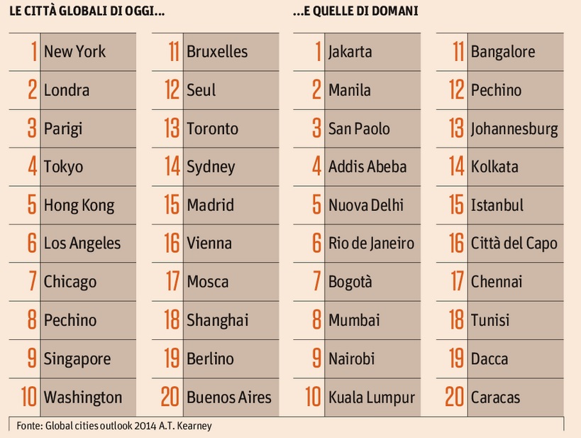 Sempre secondo A.T. Kearny, questa è la classifica delle metropoli di domani: