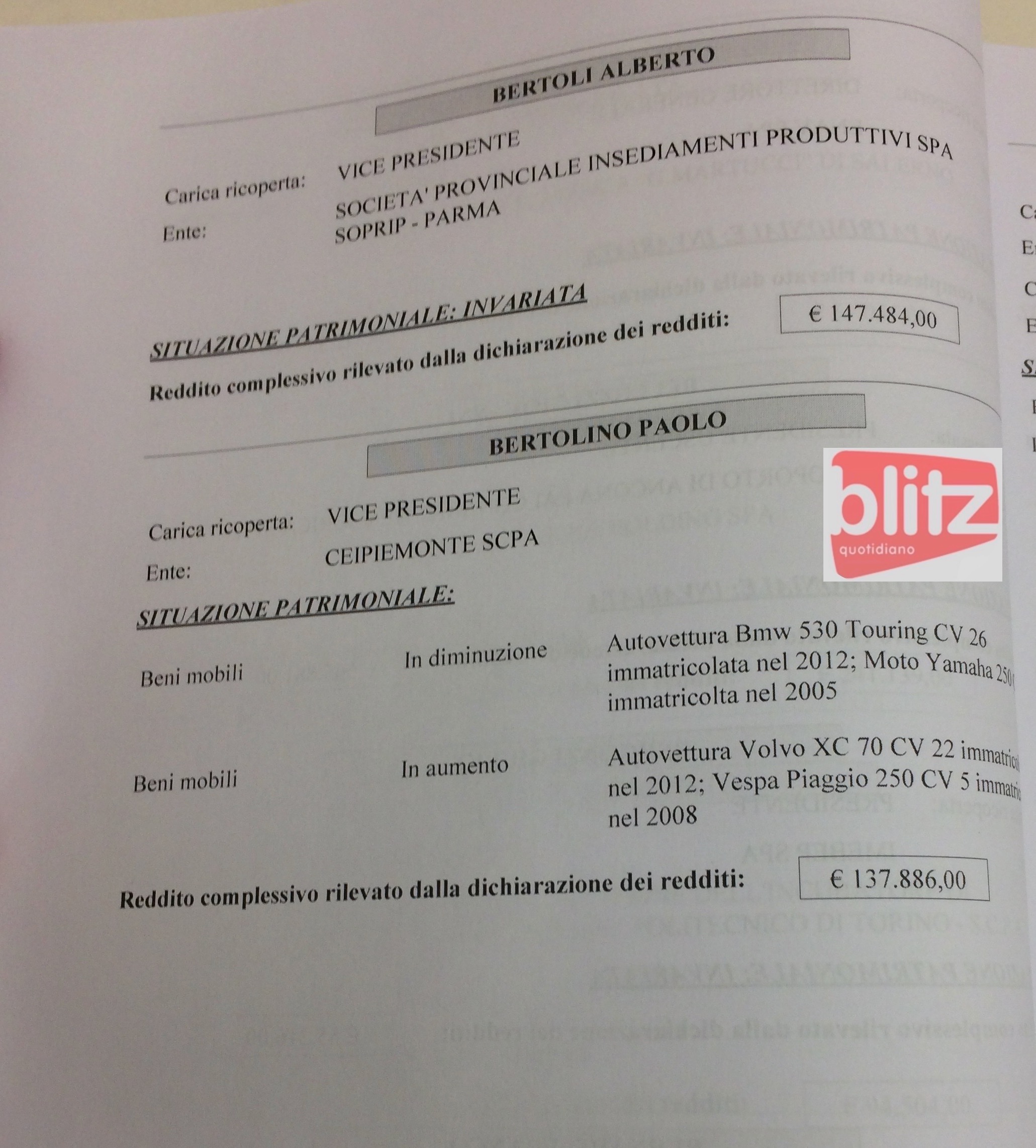 - Alberto Bertoli Vicepresidente Società provinciale insediamenti produttivi Spa – Soprip Parma 147.484
