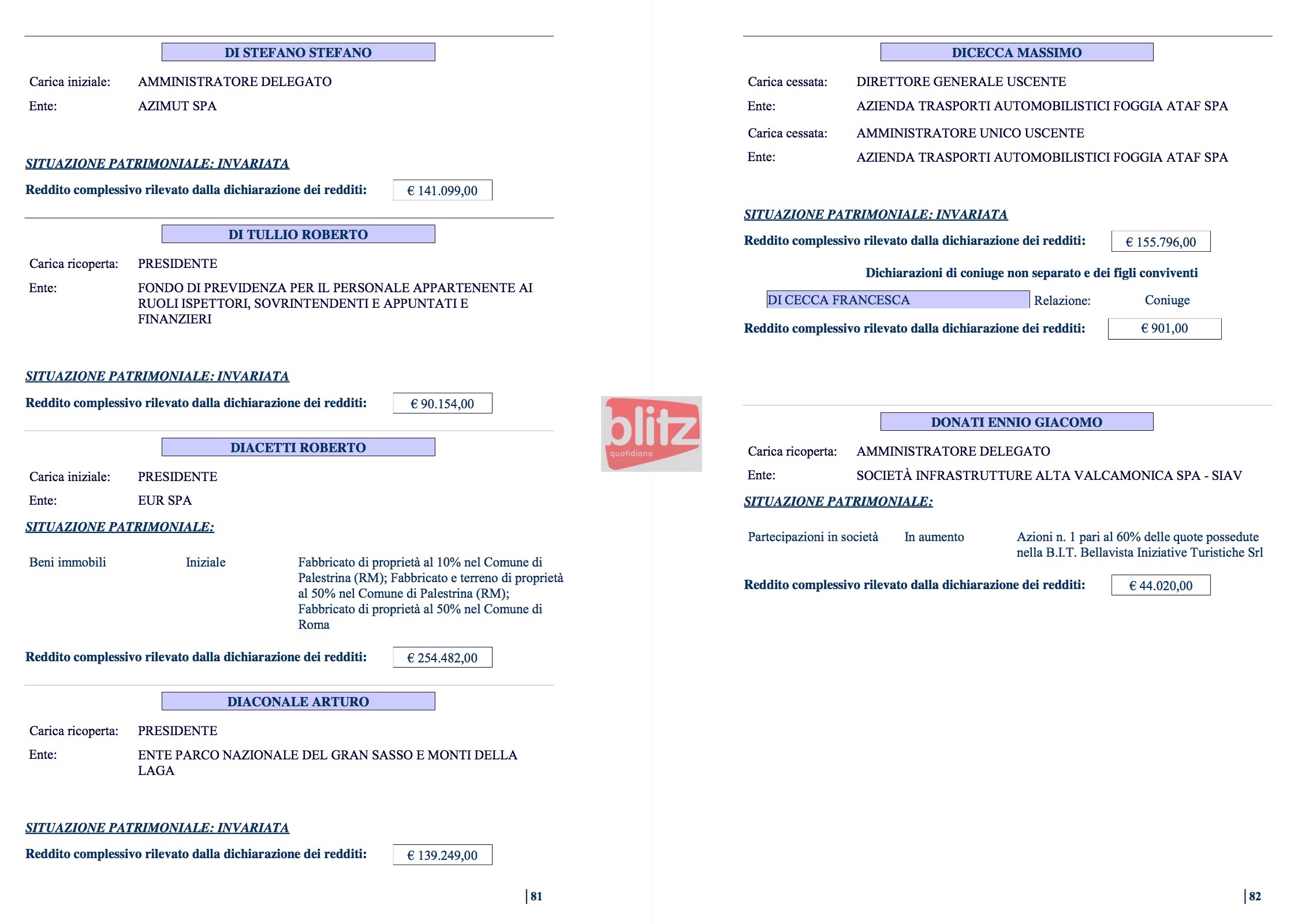 - Massimo Dicecca Direttore generale uscente e Amministratore unico uscente Azienda trasporti automobilistici Foggia ATAF Spa 155.796 (Coniuge: Francesca Di Cecca 901)