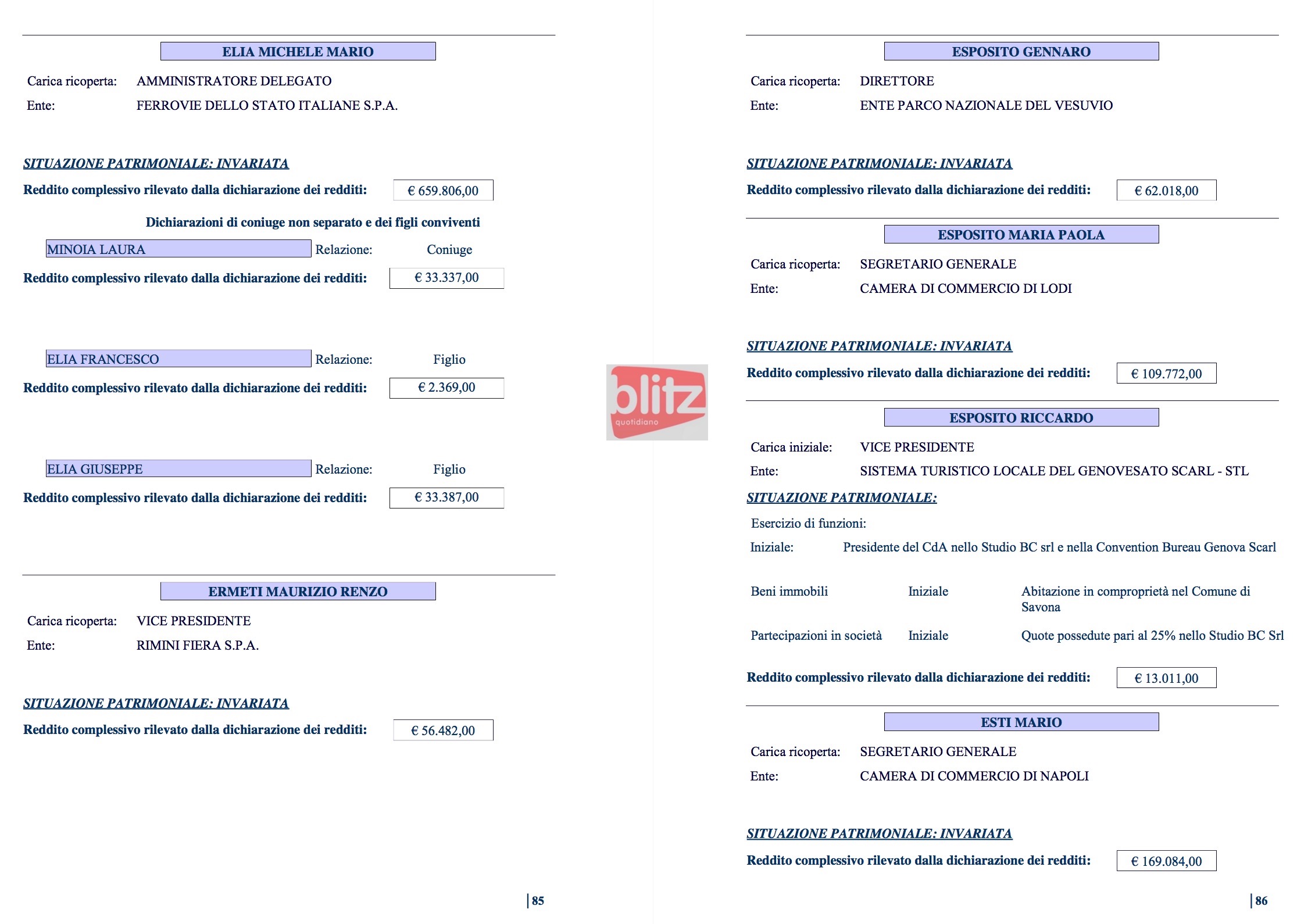 - Michele Mario Elia Amministratore delegato Ferrovie dello Stato Italiane Spa 659.806 (Coniuge: Laura Minoia 33.337. Figlio: Francesco Elia 2.369. Figlio: Giuseppe Elia 33.387)