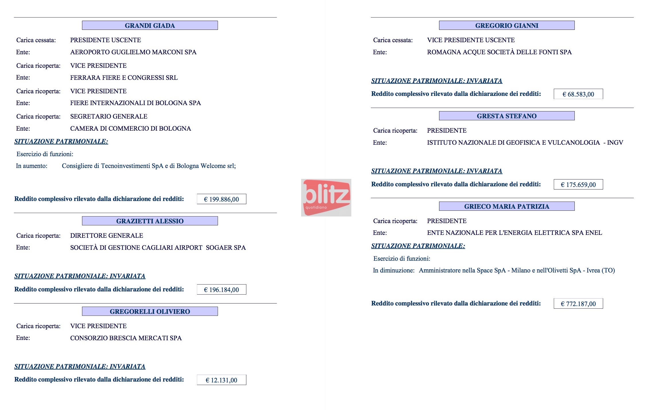 - Giada Grandi Presidente uscente Aeroporto Guglielmo Marconi Spa, Vicepresidente Ferrara Fiere e Congressi Srl, Vicepresidente Fiere Internazionali di Bologna Spa e Segretario generale Camera di Commercio di Bologna 199.886