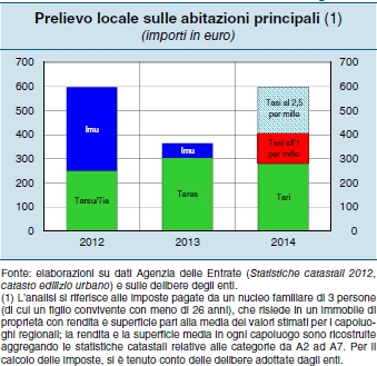 La simulazione di Palazzo Koch porta a questa conclusione: “Considerando un’abitazione principale non di lusso, nella media dei Comuni capoluogo il prelievo si è ridotto complessivamente di circa il 40 per cento fra il 2012 e il 2013 (la componente relativa ai servizi sarebbe aumentata di circa il 20 per cento, a fronte di una riduzione di oltre l’80 per cento di quella patrimoniale). Nel 2014, nell’ipotesi di applicazione della Tasi ad aliquota base, il prelievo aumenterebbe di circa il 12 per cento (rimanendo comunque ben al di sotto del livello registrato nel 2012); se ciascun capoluogo applicasse un’aliquota pari al 2,5 per mille, il prelievo complessivo crescerebbe di oltre il 60 per cento rispetto al 2013″.