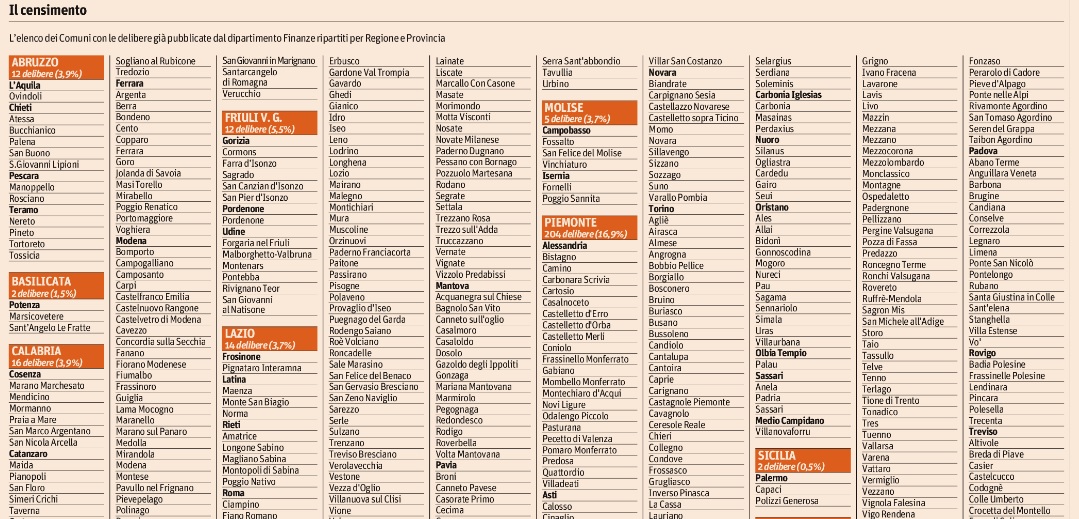 Di questi, 963 Comuni sono del centro nord: in pratica, solo 1 Comune su 10 si trova nelle regione del Mezzogiorno. Tuttavia, la corsa alla delibera per approntare entità dell’aliquota e condizioni eventuali per le detrazioni non è ancora finita: mancano due giorni al 23 maggio, data limite (mentre entro il 31 maggio devono essere state pubblicate dal Ministero delle Finanze.