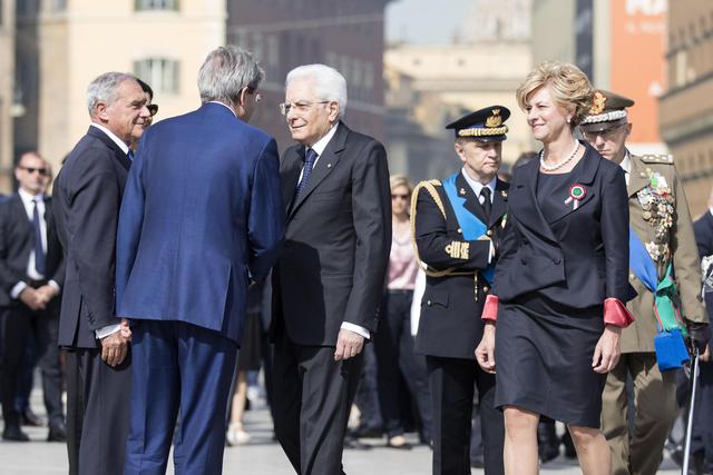 Il Capo dello stato Sergio Mattarella, Il Presidente del Senato Pietro Grasso, il Presidente della Camera Laura Boldrini, il Presidente del Consiglio Paolo Gentiloni alla Festa della Repubblica 2 giugno 2017 a Roma