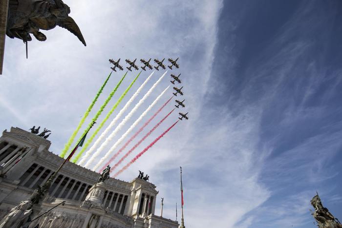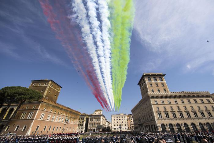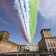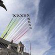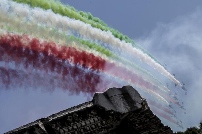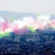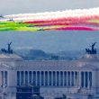 Italian Air Force’s aerobatic demonstration team, the Frecce Tricolori leave a colourful vapour trail as they fly over the Altare della Patria in Rome on occasion of the Republic Feast, 2 Jun 2017. ANSA/CLAUDIO PERI