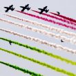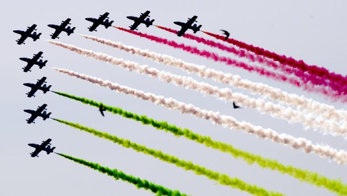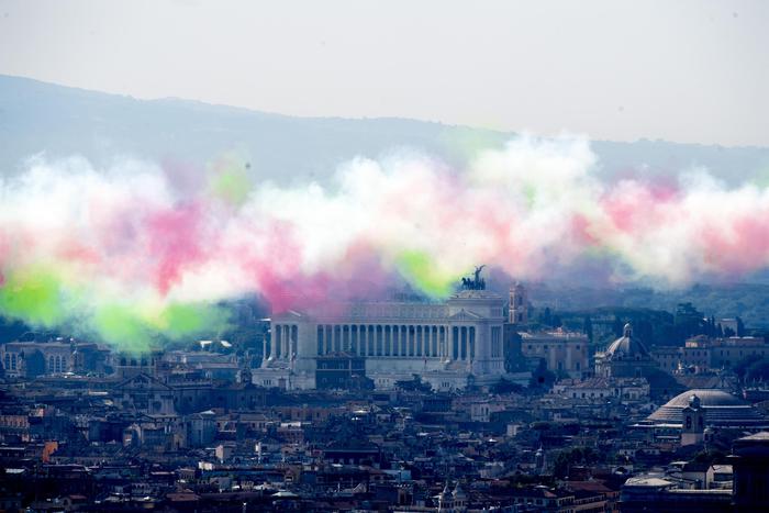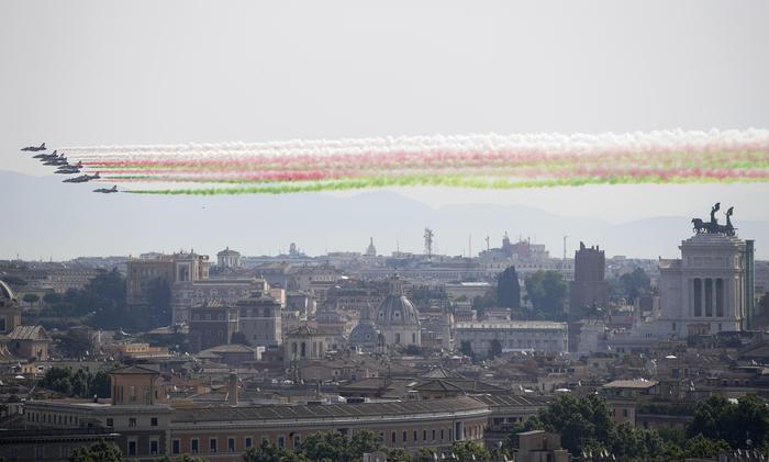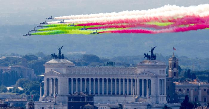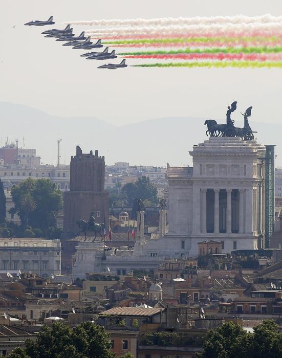 Italian Air Force’s aerobatic demonstration team, the Frecce Tricolori leave a colourful vapour trail as they fly over the Altare della Patria in Rome on occasion of the Republic Feast, 02 Jun 2017.