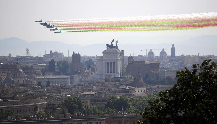 The Frecce Tricolori Italian Air Force acrobatic squad flies the Monument of the Unknown Soldier, venue of a military parade to celebrate the 71st anniversary of founding of the Italian Republic in 1946, Friday, June 2, 2017. (ANSA/AP Photo/Alessandra Tarantino)