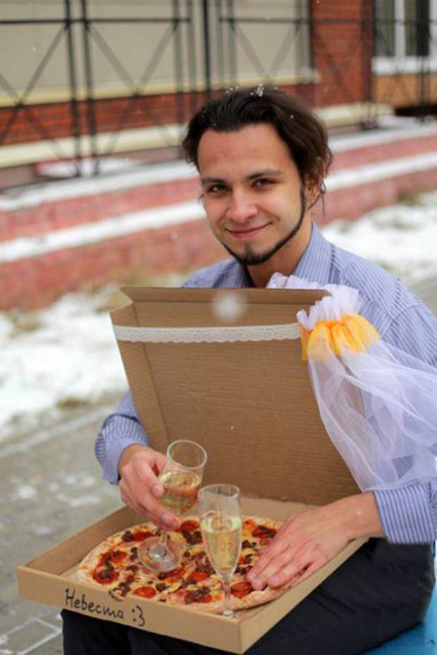 Pic shows: 22-year-old Russian marries a pizza.nnA lonely Russian gourmet fed up of not having a better half has married a pizza.nnThe bizarre wedding ceremony took place in a pizzeria in the city of Tomsk, in the Tomsk Oblast region that is located in south-central Russia.nnThe man who was not named said he came up with the idea because she was fed up of being alone.nnHe said: “At some point I realized that half of my friends are complaining about their better half, while the others were complaining about the lack of a better half.”nn”Love between two humans is a complicated wild thing. I was grateful that I had at least my love of food and then it came to me that actually love for food remains stable no matter what.”nn”Pizza would not reject you or betray you, and speaking quite frankly and sincerely, I love it.”nnSceptical Russian authorities refused to give official permission to register the unusual marriage at a registry office, and the church also turned him down.nnSo in the end the unusual ceremony went ahead in one of the city¿s pizzerias. Managers and cooks at the restaurant even went as far as to provide the man with a certificate of marriage, and the pizza bride was covered in a bridal veil.nnAfter that the happy groom posed in front of many cameras with his “wife”. Details of what they did on their honeymoon night together were not revealed.nn(ends)