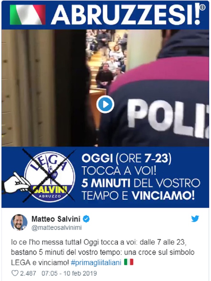 Non tarda la risposta a colpi di tweet di Nicola Zingaretti del Pd. “Oggi si vota in Abruzzo e il ministro degli Interni Salvini viola la legge elettorale facendo propaganda. Pensano al partito distruggendo l’Italia. L’arroganza e l’incapacità al potere. Iniziamo a mandarli a casa”.