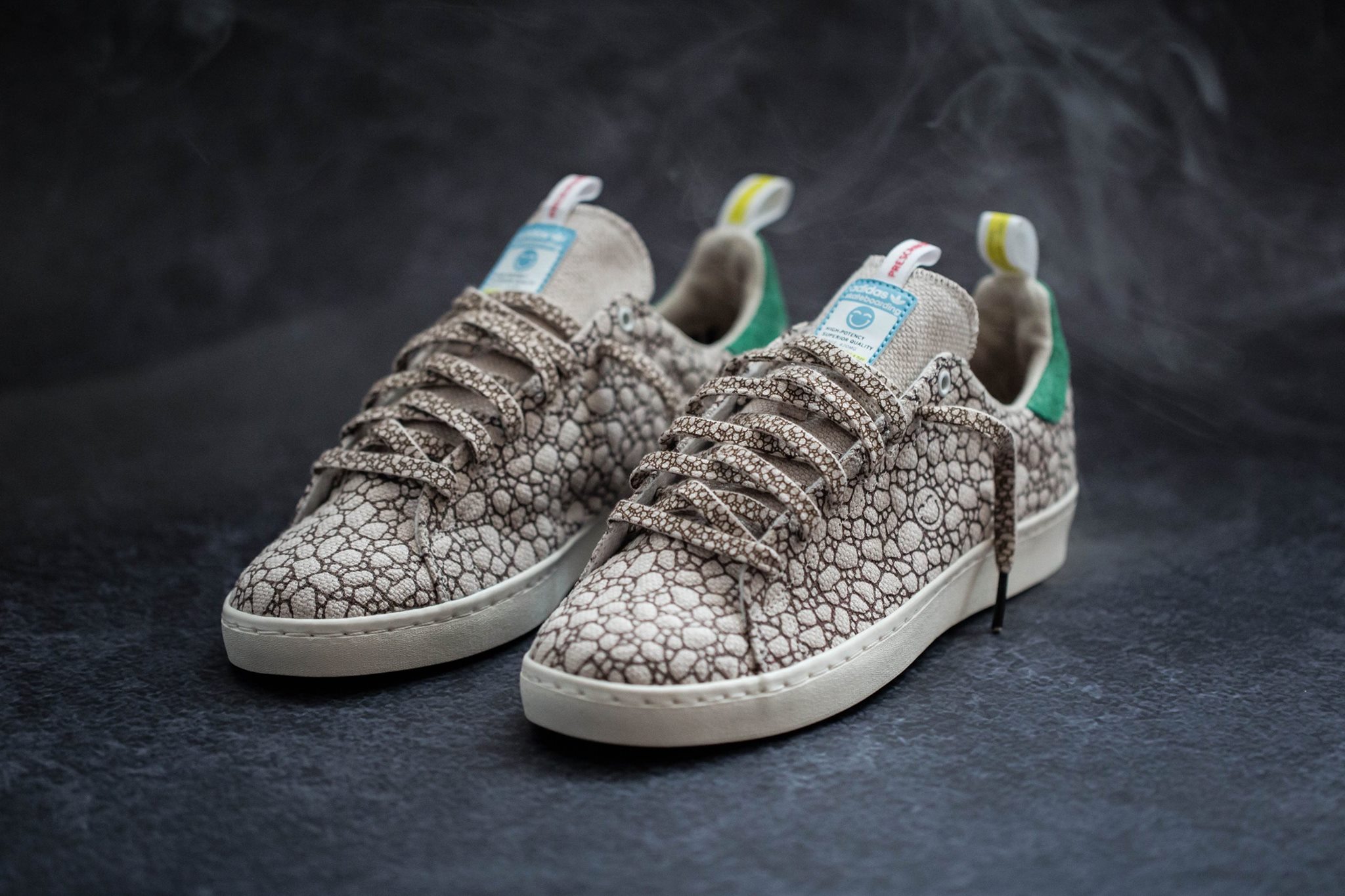 Le scarpe Adiddas Happy 420 verranno lanciate online a partire dal 15 aprile prossimo. Ma non si possono comprare come un semplice, normale e banale paio di scarpe qualsiasi. Infatti queste Adidas potranno essere solamente vinte alla riffa di BAIT, negozio online di abbigliamento sportivo.