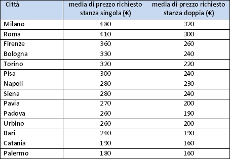 “Firenze (360 euro per la singola, 260 per il posto in doppia), Bologna (330 per una stanza singola, 240 per la doppia) e Torino (320 euro per la singola, 220 per il posto in una stanza condivisa). Si risparmia al Sud, con prezzi medi per la singola sotto i 200 euro a Catania e Palermo”.