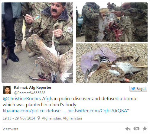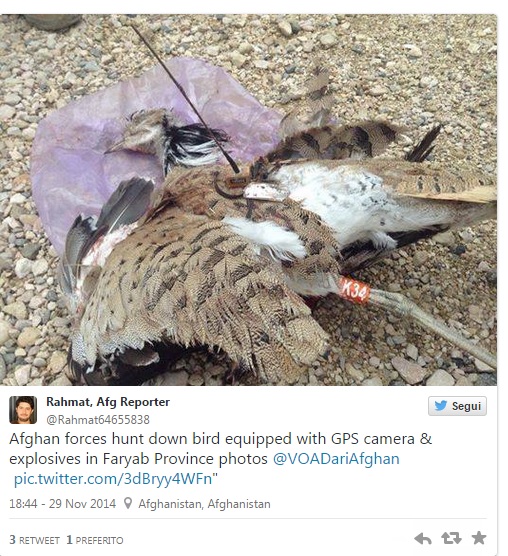 ROMA – La polizia afghana ha sparato ed ucciso un uccello selvatico simile ad un grosso fagiano, da cui spuntata un’antenna. Gli agenti lo hanno ucciso dopo essersi insospettiti ed hanno avuto ragione: l’uccello era dotato di esplosivo, di un tracciatore Gps e di un detonatore.