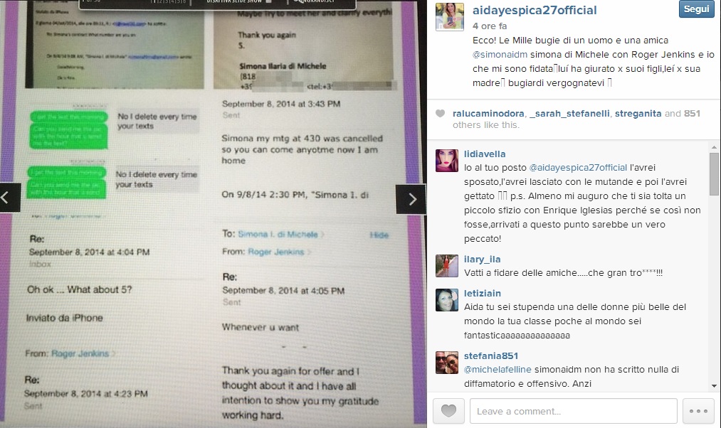 ROMA – Aida Yespica sceglie Instagram per svelare il tradimento del suo fidanzato Roger Jenkins. La showgirl venezuelana ha postato sul social network delle conversazioni inequivocabili tra Roger Jenkins e la sua amica Simona Di Michele.
