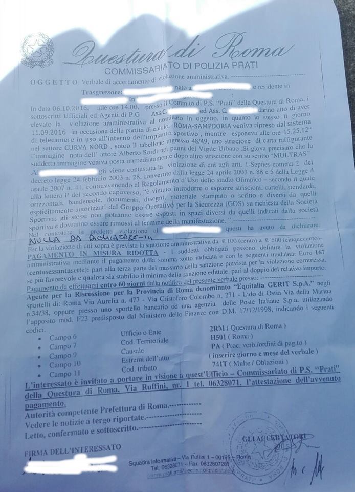 La foto della multa recapitata al tifoso pubblicata sul profilo Facebook dell’avvocato Lorenzo Contucci.; “Si giova precisare che la suddetta immagine veniva posta immediatamente dopo altro striscione con su scritto MULTRAS”.