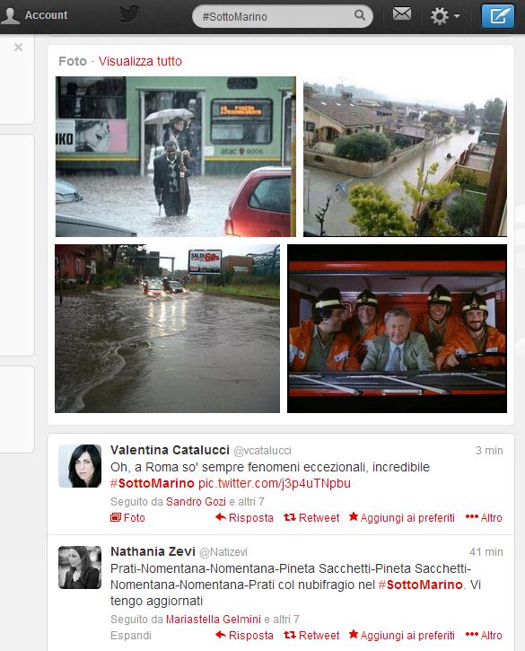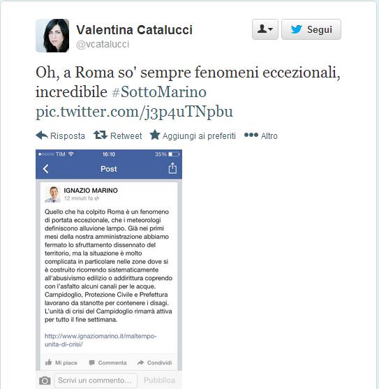 Ovviamente la portata del nubifragio (o della neve, del vento, del caldo o dell’umidità) è definita come “eccezionale” e la colpa è sempre di qualcun altro. Scrive su Twitter Valentina Catalucci: