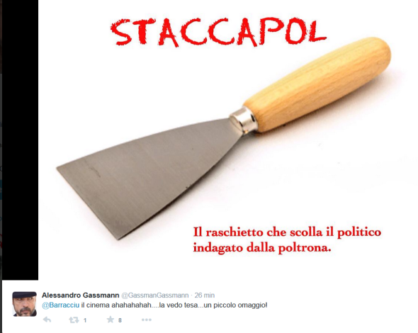 Tutto inizia quando l’attore pubblica un tweet sugli indagati, e ancora in carica, presso il governo dopo le dimissioni del ministro Maurizio Lupi. La Barracciu prima risponde e poi cancella il cinguettio, dando il via ad un serrato botta e risposta in cui la sottosegretaria usa un italiano non proprio corretto quando a Gassmann che l’attacca scrive: