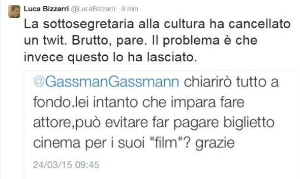 “La sottosegretaria alla cultura ha cancellato un twit. Brutto, pare. Il problema invece è che questo l’ha lasciato”.