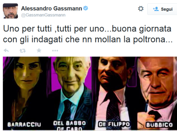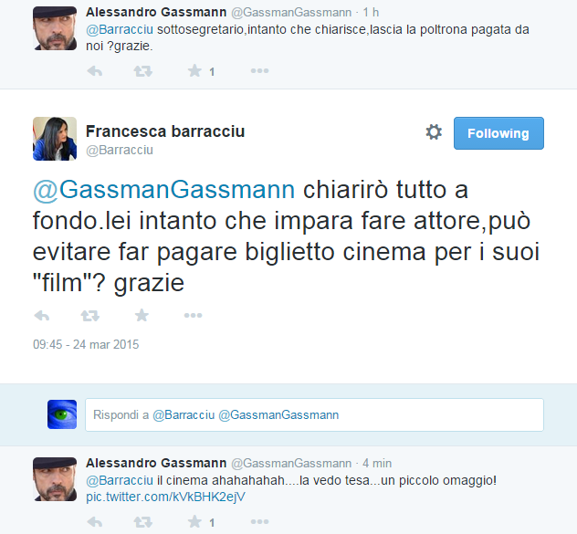 Tutto inizia quando l’attore pubblica un tweet sugli indagati, e ancora in carica, presso il governo dopo le dimissioni del ministro Maurizio Lupi. La Barracciu prima risponde e poi cancella il cinguettio, dando il via ad un serrato botta e risposta in cui la sottosegretaria usa un italiano non proprio corretto quando a Gassmann che l’attacca scrive: