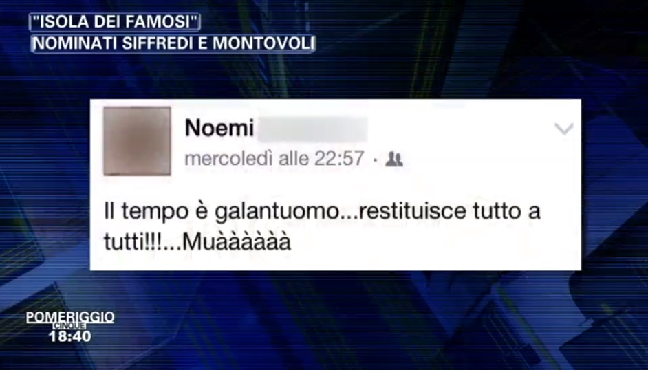 ROMA – “C’è una ragazza, che si chiama Noemi e che è pronta a raccontare gli ultimi anni di vita accanto ad Alex Belli” dice, riprendendo una dichiarazione di Alfonso Signorini , Gabriele Parpiglia a Pomeriggio 5. Alex Belli, sposato, è uno dei naufraghi dell’Isola dei famosi, troppo spesso troppo vicino alla sexy naufraga Cristina Buccino. Ma adesso si parla di una presunta amante anche nella vita reale di nome Noemi. E la stessa Noemi, come dice e riporta Pomeriggio 5, su Facebook più volte ha commentato le vicende di Belli sull’Isola. “Il tempo è galantuomo” si legge in un post.