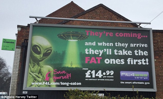 LONDRA – “Gli alieni stanno arrivando e prenderanno i grassi per primi“. Questo lo slogan della palestra Fit4Less nel Derbyshire, in Gran Bretagna, che avvisa le persone “in carne” di essere in pericolo e le invita a recarsi in palestra per dimagrire. Uno spot che non è piaciuto a molte persone, che lo hanno definito offensivo nei confronti degli obesi, mentre i proprietari della palestra hanno replicato dichiarando che lo spot voleva essere divertente.
