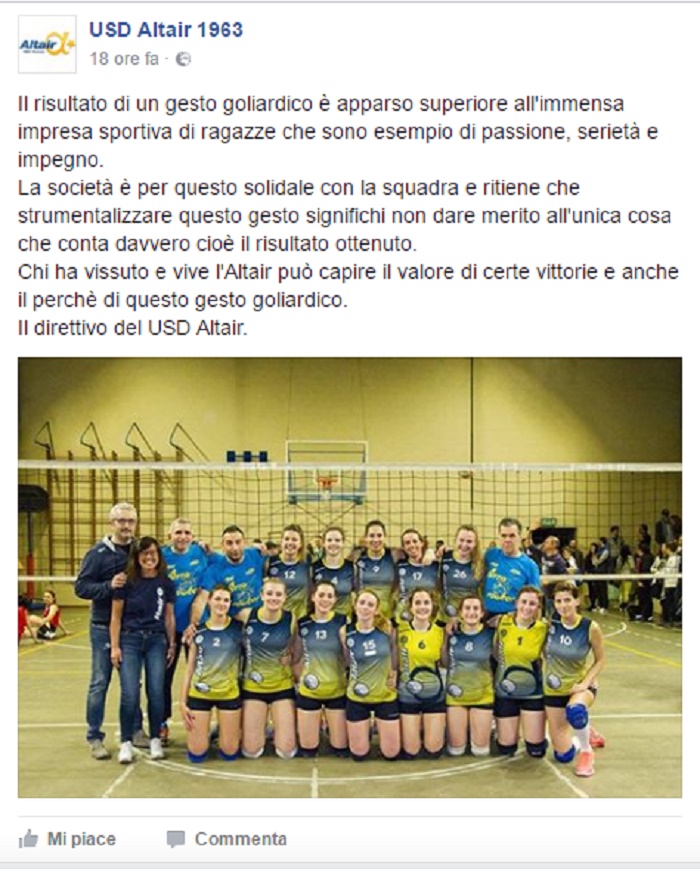 “Il risultato di un gesto goliardico è apparso superiore all’immensa impresa sportiva di ragazze che sono esempio di passione, serietà e impegno. La società è per questo solidale con la squadra e ritiene che strumentalizzare questo gesto significhi non dare merito all’unica cosa che conta davvero cioè il risultato ottenuto. Chi ha vissuto e vive l’Altair può capire il valore di certe vittorie e anche il perché di questo gesto goliardico”.
