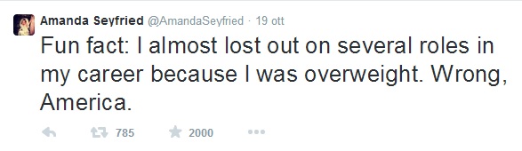 LOS ANGELES (STATI UNITI) – “Nella mia carriera ho rischiato di perdere tanti ruoli perché sono stata giudicata dai produttori di Hollywood in sovrappeso. Per fortuna che mi tengo in forma con la corsa e l’esercizio fisico”. Lo ha scritto sul proprio profilo Twitter Amanda Seyfried.