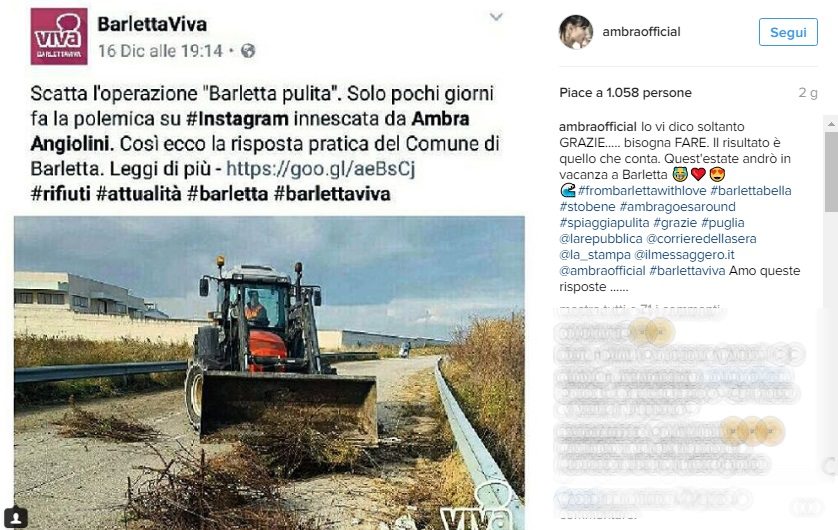 “Ma siccome a farla è stata Ambra Angiolini, come risultato non ci sono stati solo i «mi piace», ma una valanga di commenti e la decisione del Comune di Barletta di pulire, finalmente, un ampio tratto di costa. «Vedere quella sporcizia mi ha fatto male. Se ci vivessero i miei figli?, ho pensato. E così l’ho denunciato, non dichiarando però dove fossi perché so che il degrado c’è ovunque».