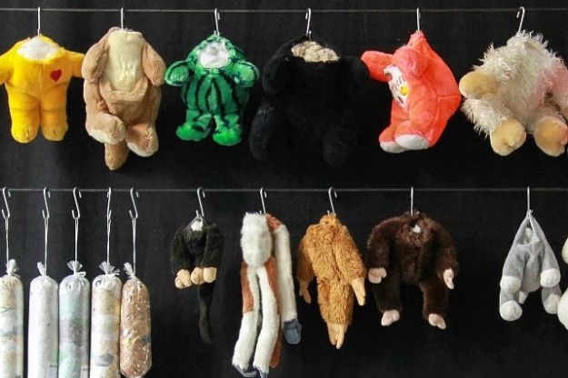 AMBURGO – Tagliati, squartati, insaccati o appesi a un gancio, con l’imbottitura che straborda da ogni fenditura, come fossero animali veri. Questo è lo scenario in cui potreste imbattervi entrando nella macelleria per peluche di Miroslav Menschenkind, ad Amburgo. Va da sé che non di vera macelleria si tratta, ma di una installazione artistica, opera di un vegetariano (figlio di un macellaio) che spera così di sensibilizzare i suoi avventori sulle violenze alle quali vengono sottoposti gli animali da macello.